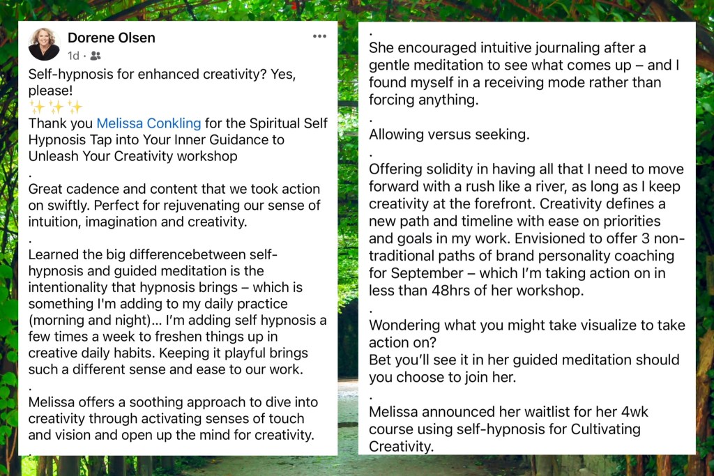 Dorene joined me Tuesday night for the free workshop on self-hypnosis for creativity. Less than 48 hours later, she posted her experience from the meditation…and that she’s taking action on her ideas already!!